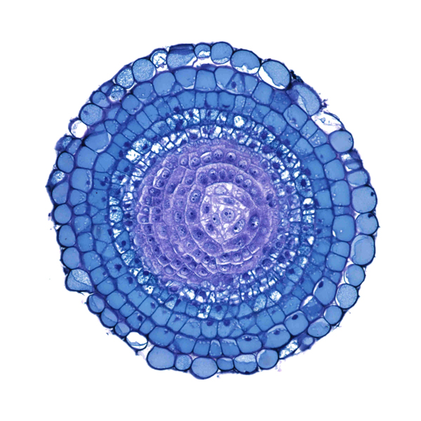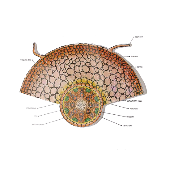 Model shows the pointed growth resulting from an apical cell with the cells which branch out spirally from point of vegetation. Root shown in longitudes & transverse section, detachable crown of the root removable, mounted on base with key card.