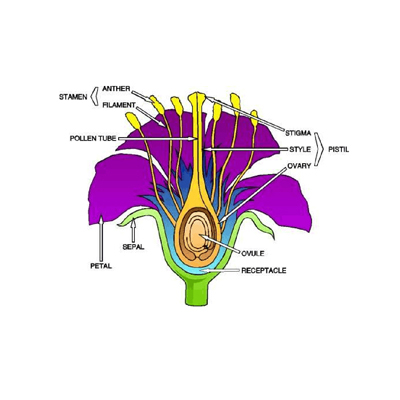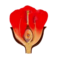 Model of typical flower, all parts detachable, ovary with a single ovule inside, mounted on base with key card.
