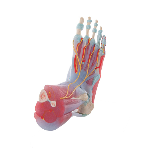 Life size model, dissectible in 3 parts. The plantar aponeurosis and the flexor brevis can be removed to show the underlying network of muscles, tendons, vessels and nerves. A deeper plantar dissection allows observation of the plantar muscles and plantar nerve branches. A superficial dorsal dissection shows ligaments, nerves and vessels.