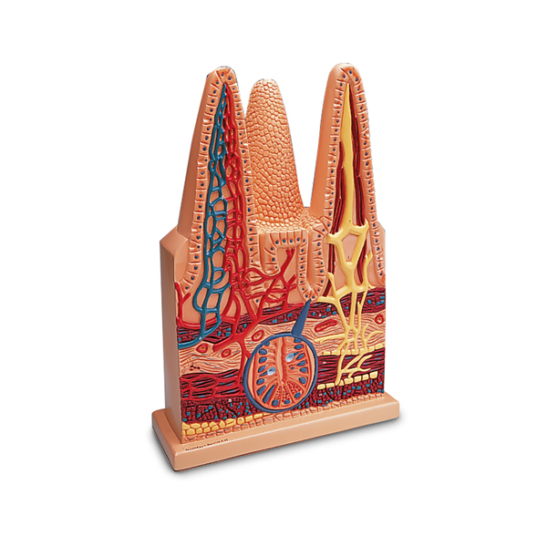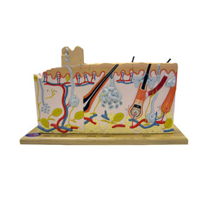 70 times enlarged, this model shows the structure of the human skin in 3 dimensions.
