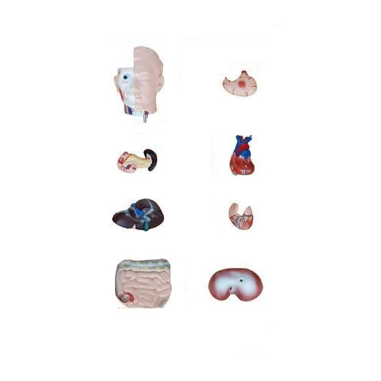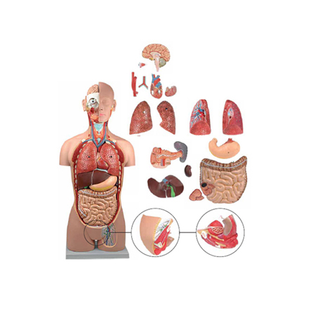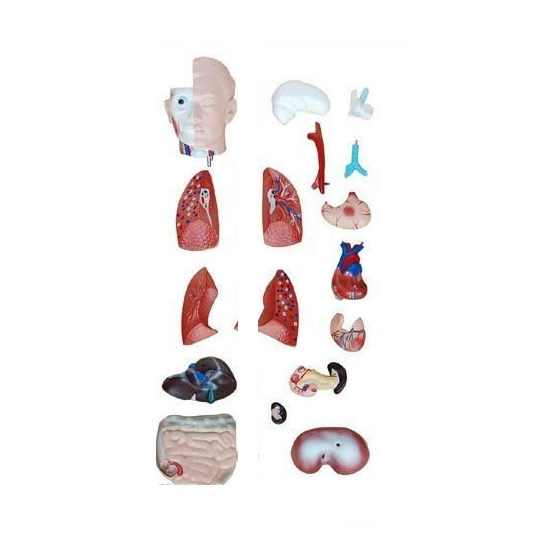 Natural size dissectible into 18 parts, mounted on base with key card. Showing ribs, sternum, clavicle with their attachments, thoracic and abdominal organs detachable individually like lungs, heart, stomach, liver, intestine for detailed study. Half of the skull cap is removable to show brain and its structure, which can be taken out, sectioned head and neck are showing internal organs of that re.
