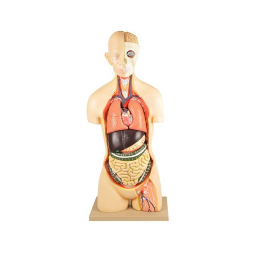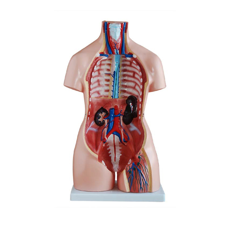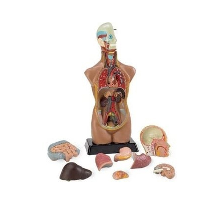 This life size sexless torso mounted on a base, composed of 16 parts, All of the major organ systems are represented with great attention to accuracy and detail. Structures are numbered and identified on the accompanying key card.