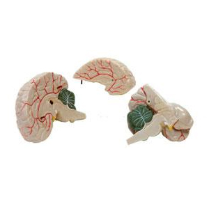 A life size brain model divided medially in 4 parts along the sagittal plane. It shows the left and right cerebrum, cerebellum, brain stem and blood vessels, with Key Card.
