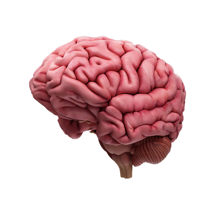 A life size brain model divided medially in 2 parts along the sagittal plane. It shows the left and right cerebrum, cerebellum, brain stem and blood vessels, with Key Card.