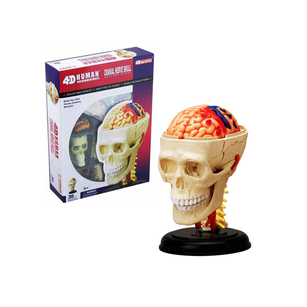 Dissectible in 3 parts, full size, showing important parts of skull and cranial nerves, mounted on base with key card.
