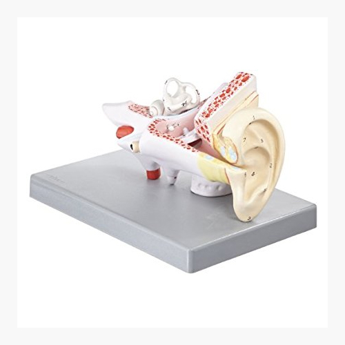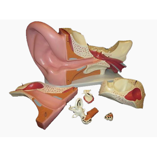 3X life size. The model shows the external, middle and inner ear. The eardrum with malleus, incus and stapes are removable. The other removable parts are composed of: cochlea and labyrinth with vestibular and cochlear nerves, 2 bone sections that define the middle and inner ear.