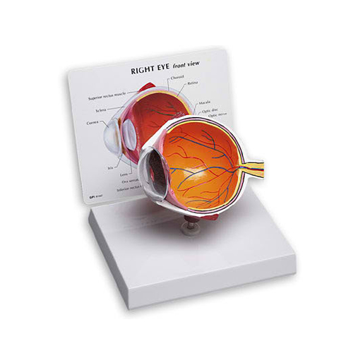 Dissectible into 8 parts, 5 Times enlarged model includes eyelids showing the bony orbit with intraocular muscles, a tear duct, and lachrymal gland. Cornea, muscles, 2 part choroid with iris, retina, and optic nerve; clear lens; and clear vitreous humor are removable, mounted on a stand with key card.