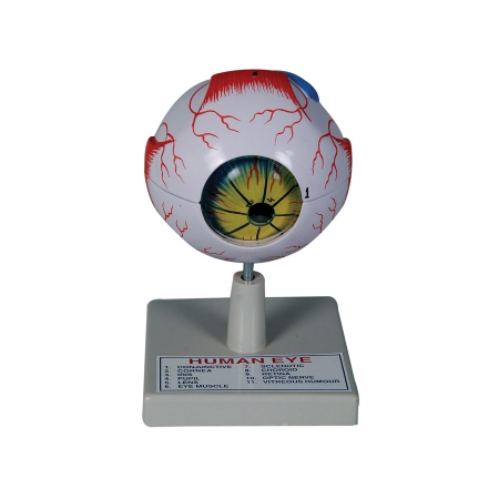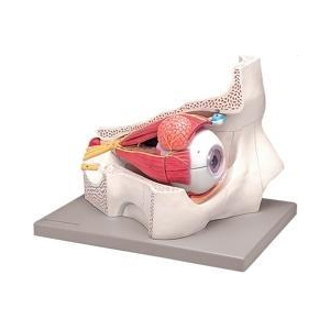 Dissectible into 7 parts, 4X life size, shows the eyeball with optic nerves and muscles in its natural position in the bony orbit, mounted on a stand with numbered key card.