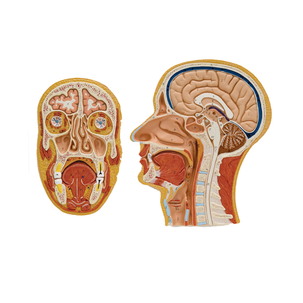 Life size representation of the superficial and the internal structures of the head and neck. Comparison between frontal and median sections provides a superior understanding of the anatomical structures of the head and neck, mounted on board with key card.