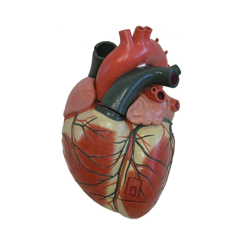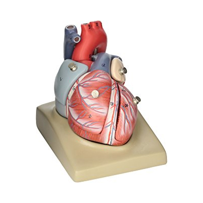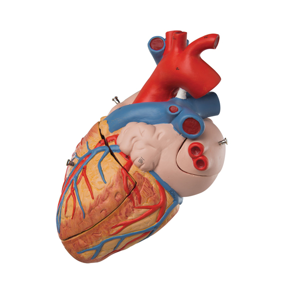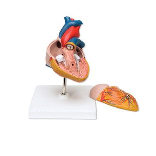 3 times life size and separates into four parts for detailed study. Sectioned so that both ventricles and atria open to expose the valves & large blood vessels near the heart and musculature of the heart are also shown, mounted on base with Key Card.