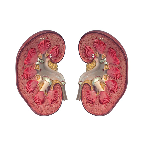 Life size model, 2 parts model of the kidney with the adrenal gland. The model is sectioned along the front plane; showing internal structures, including the cortex, medulla, pyramids with papillae, partially open renal pelvis, ureter, blood vessels.