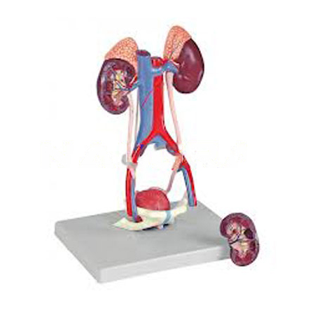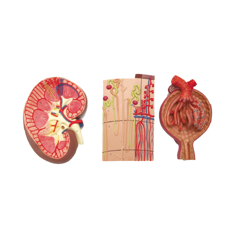 This 3 models set shows the basic structure of the kidney. The first model, a frontal section of the kidneyenlarged 3 times, illustrates the adrenal gland, cortex, medulla, pyramids with papillae, renal pelvis and blood vessels. The second model, representing a nephron enlarged 120 times, shows a renal tubules, a collecting tube system and Henle's loop. The third one illustrates Malpighian corpuscle with the Bowman's capsule, 700 times life size. All these models are a great aid to understanding the kidney anatomy in all its inner details, mounted on a base with key card.