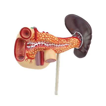 Life size model is an accurate representation of the pancreas, spleen and duodenum. The pancreas is open to show the entire pancreatic duct. The duodenum is partially dissected to expose its internal structure, mounted on base with stand.