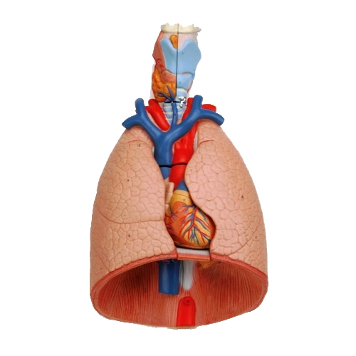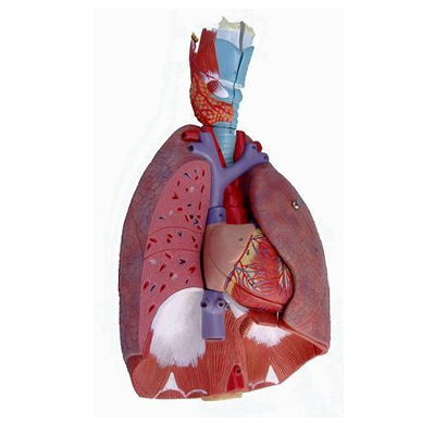 Dissectible in 2 parts, showing Larynx Trachea with bronchial tree, vena cava, aorta, 2-part heart, subclavian and vein, pulmonary artery, two parts lungs, diaphragm, oesophagus, mounted on base with key card.