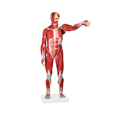 Complete human muscular and organs anatomy. It illustrates with excellent detail the superficial and deeper muscles, tendons, ligaments, vessels and body structures. The internal organs are removable for closer examination to study the relationships among all the body structures, mounted on base with stand.