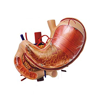 This life size model is dissected along the medial plane and can be opened to show the internal structure of the stomach, including the mucosa, the pylorus, and section of the gastric wall. The model also shows the superficial muscular layers with nerves and vascular structures and the blood vessels, mounted on base with stand and key card.