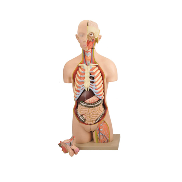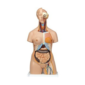 This life size torso composed of 24 parts, with interchangeable male and female genitalia, mounted on a base. All of the major organ systems are represented with great attention to accuracy and detail. Structures are numbered and identified on the accompanying key card.