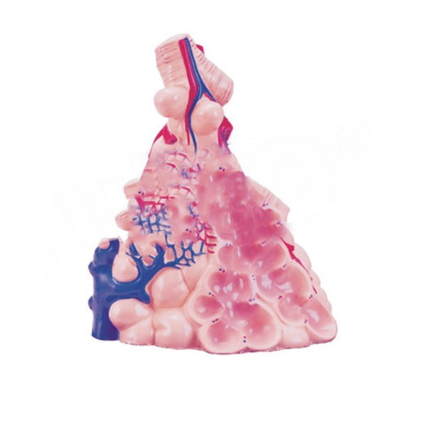 Model showing the structures involved in gaseous exchange, the alveolar epithelium, the alveoli, the capillary network, arteries, veins, bronchioles connecting to alveolar ducts, elastic fibers, smooth muscle, mucous membranes, and cartilage, mounted on a stand with key card.