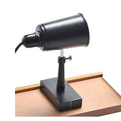 A 240 V 15W white B.C. Pygmy lamp in a conical lamp house 70 mm long x 65 mm diameter. Mounted on a 6 mm brass rod giving an optical centre height of 80 mm approx. Supplied complete with 1.5 mm of twin flex.
