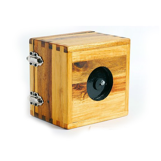 Two rectangular, open ended, light proof wood boxes. One slides into the other & contains a frosted translucent glass plate upon which image is formed.