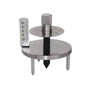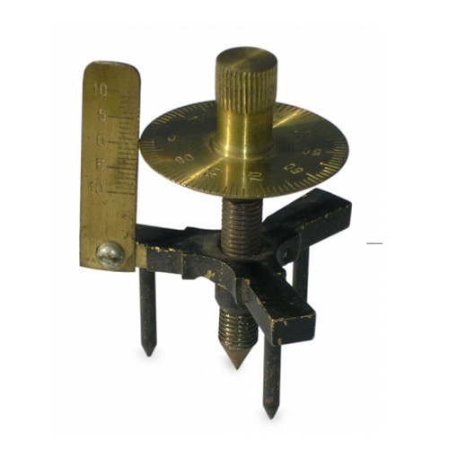 Brass dial head 40 mm diameter with stainless steel screw 0.5 mm or 0.1 mm pitch, head divided in 100 divisions, reading to .001 mm or .005 mm & registering on vertical scale10-0-10 mm frame with feet of stainless steel on p.c.d. of 46 mm. Separation approx. 40 mm.